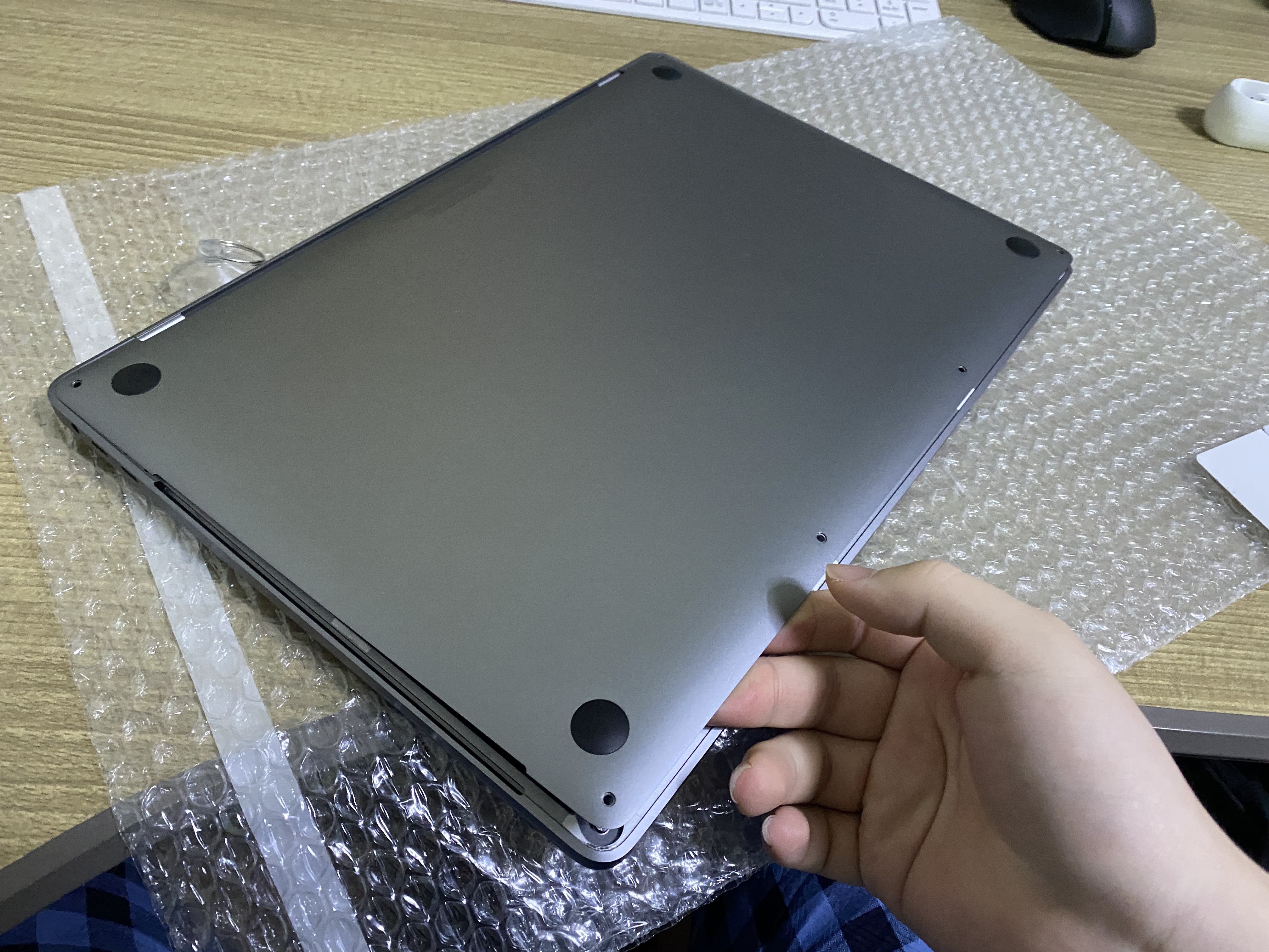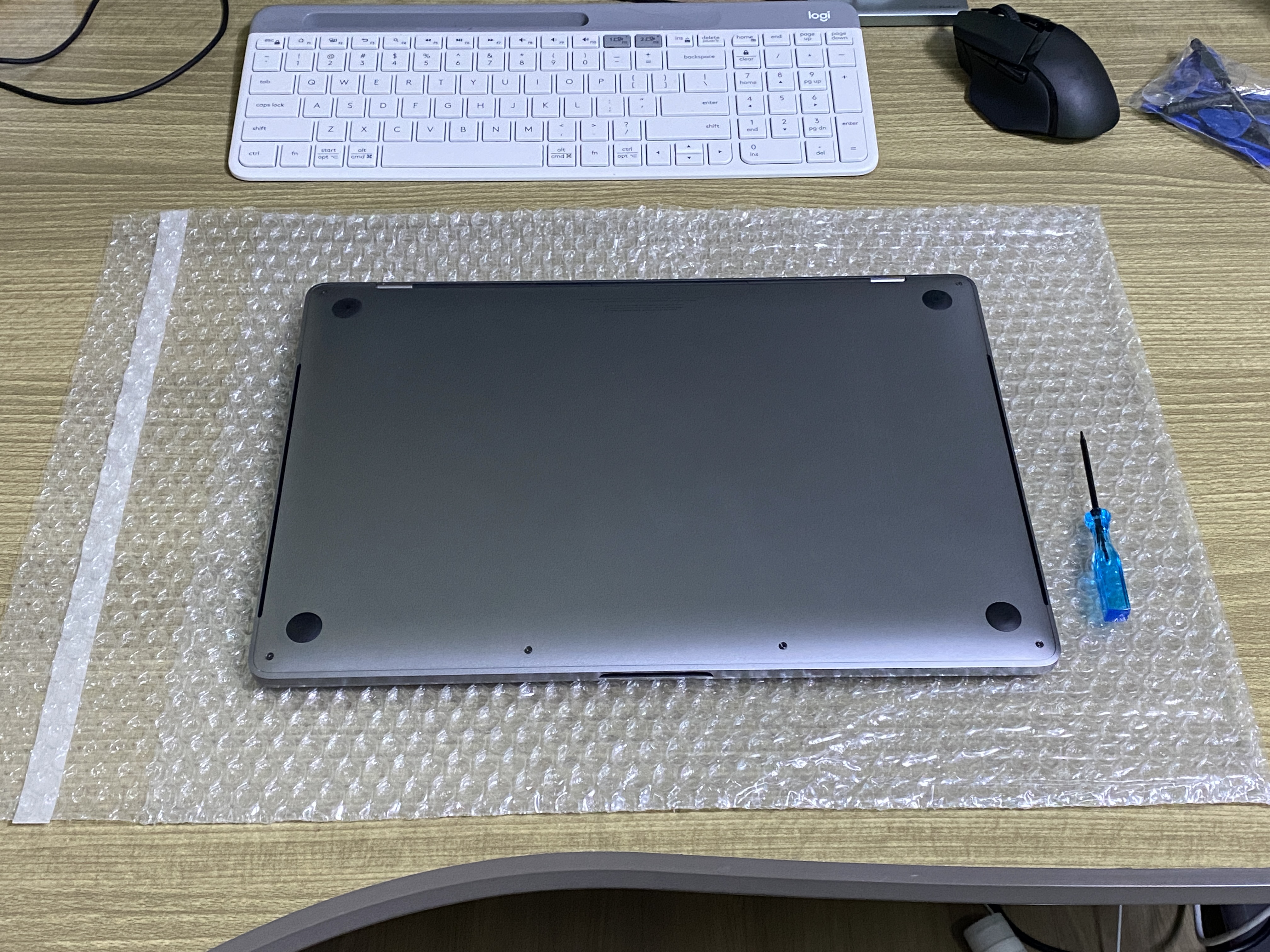일단 저는 맥북 상판에 기스나는 걸 방지하려고 아래 뽁뽁이를 깔았습니다.