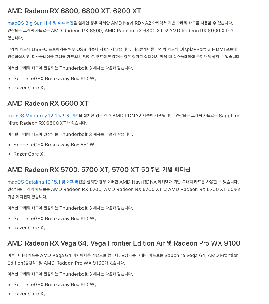 애플 공식 사이트에서 RX6600XT는 macOS Monterey 12.1 이후 버전부터 사용이 가능 했습니다.