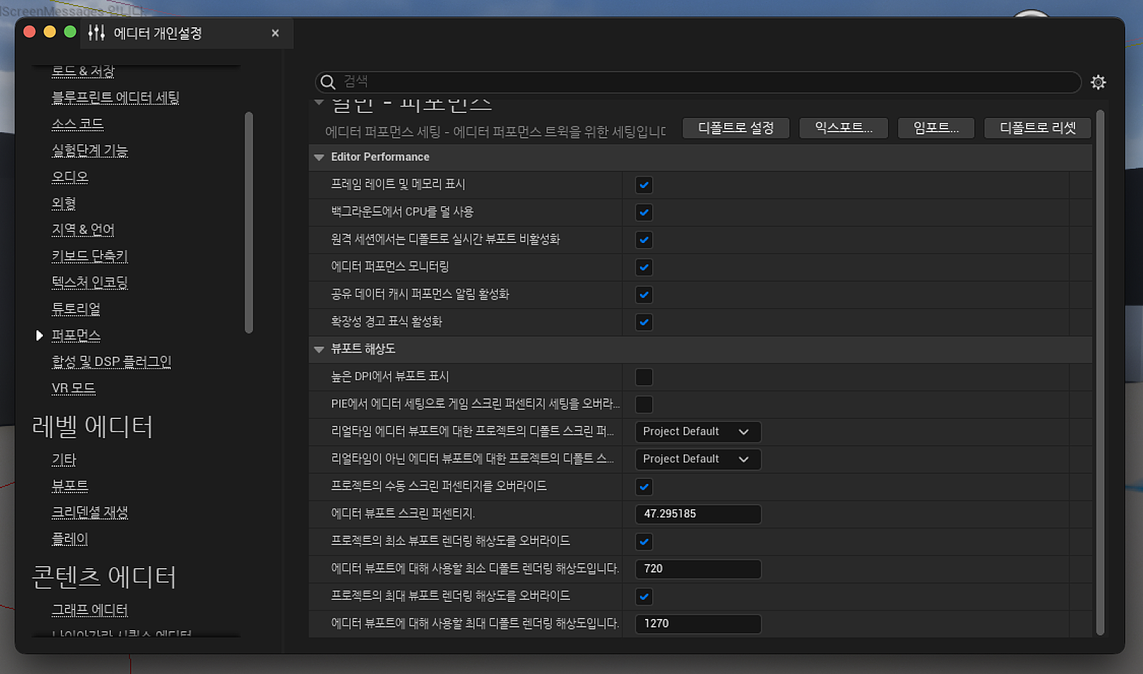 그래서 저는 바로 엔진 '개인설정' -> 퍼포먼스 -> 높은 DPI에서 뷰포트 표시를 꺼줬습니다.