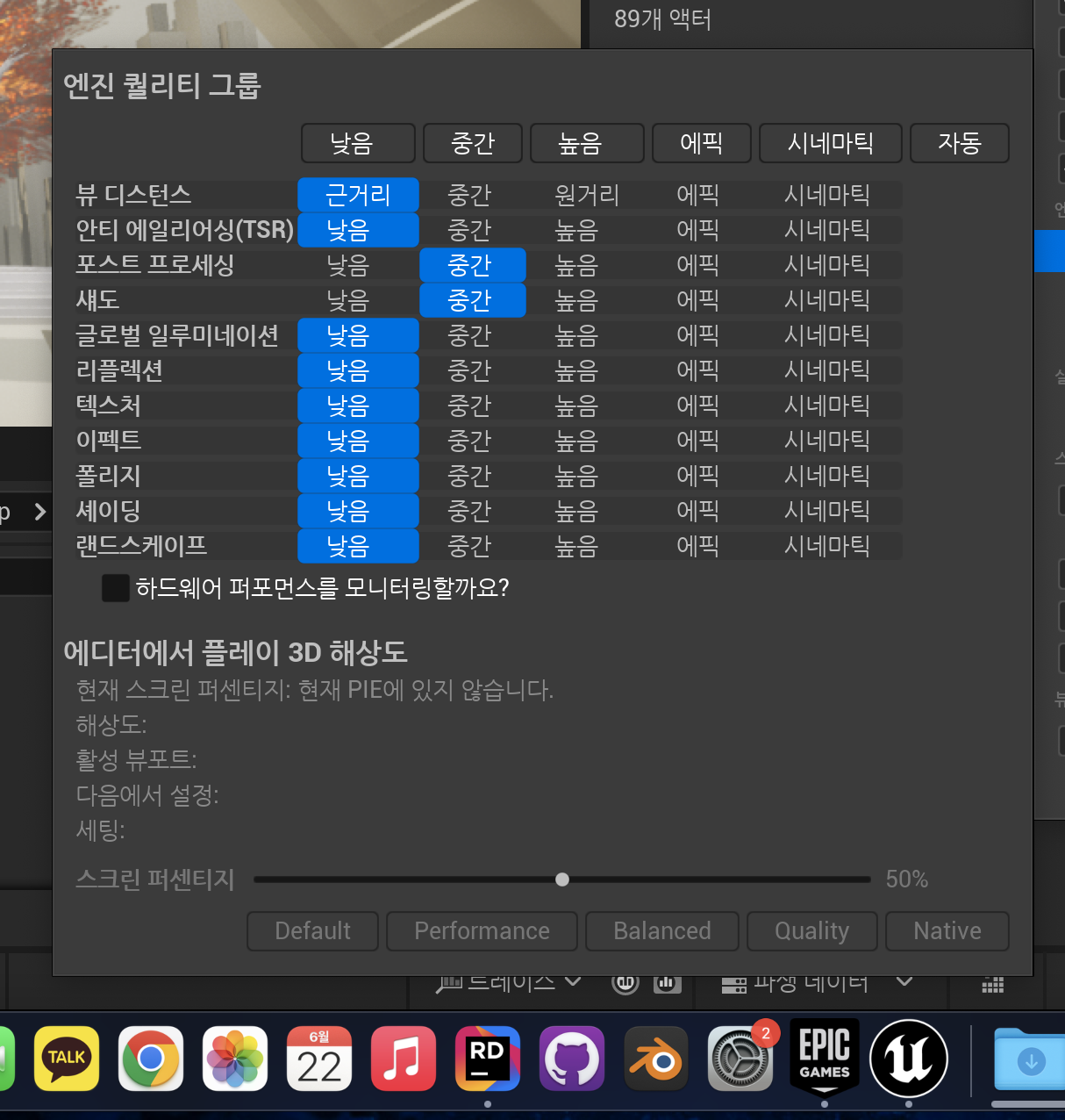 하지만 처음에 엔진을 키자마자 보니 엔진 퀄리티 세팅(그래픽 옵션)이