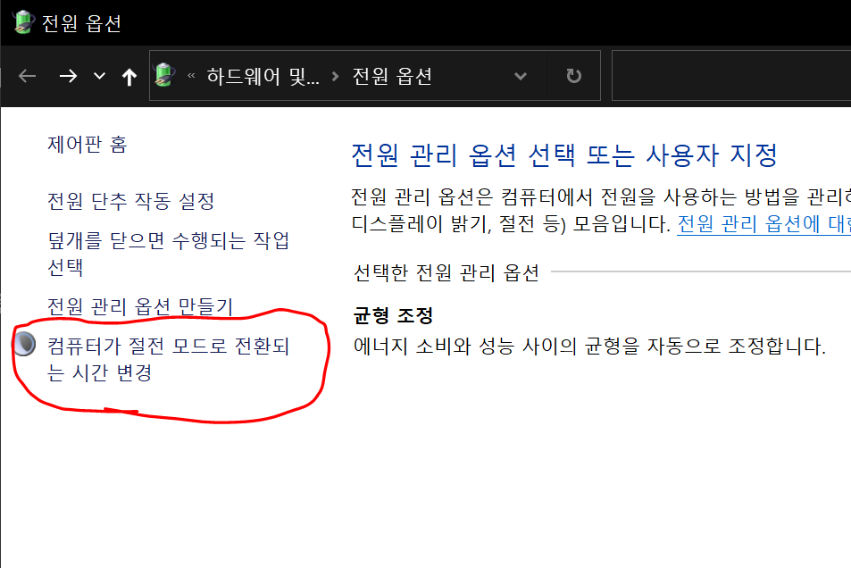 3. 나타난 전원 옵션 창에서 좌측에 '컴퓨터가 절전 모드로 전환되는 시간 변경'클릭