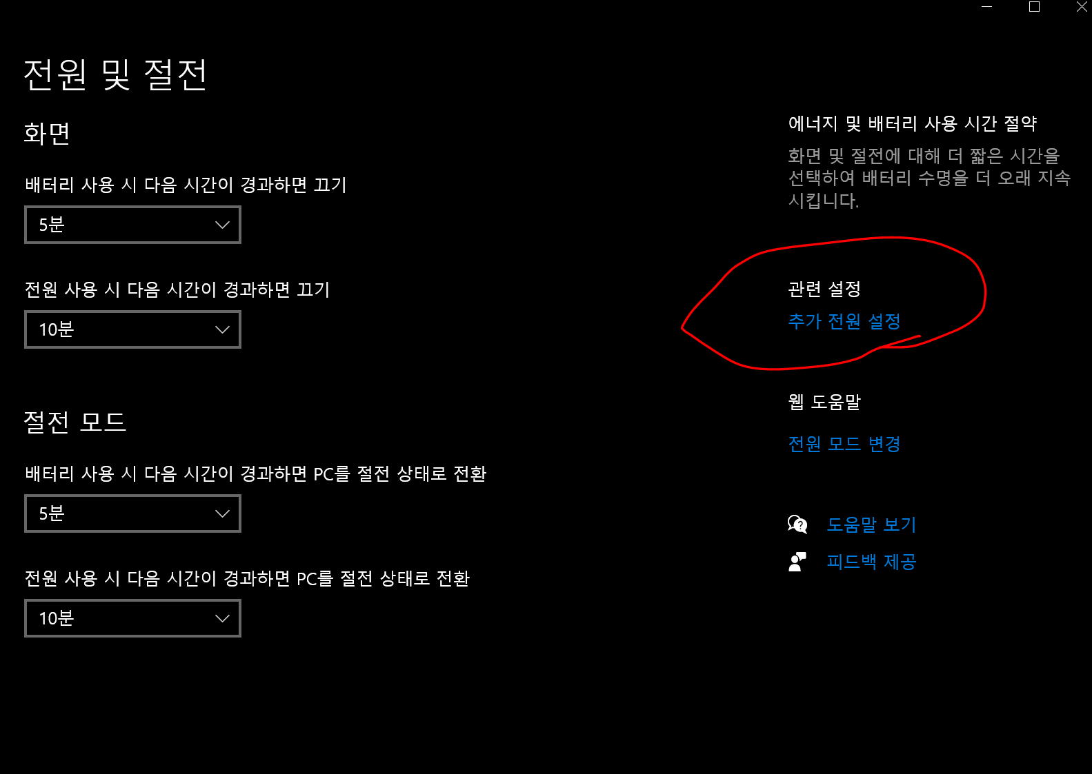 2. 전원 및 절전 설정 화면의 오른쪽 카테고리에서 '추가 전원 설정' 클릭