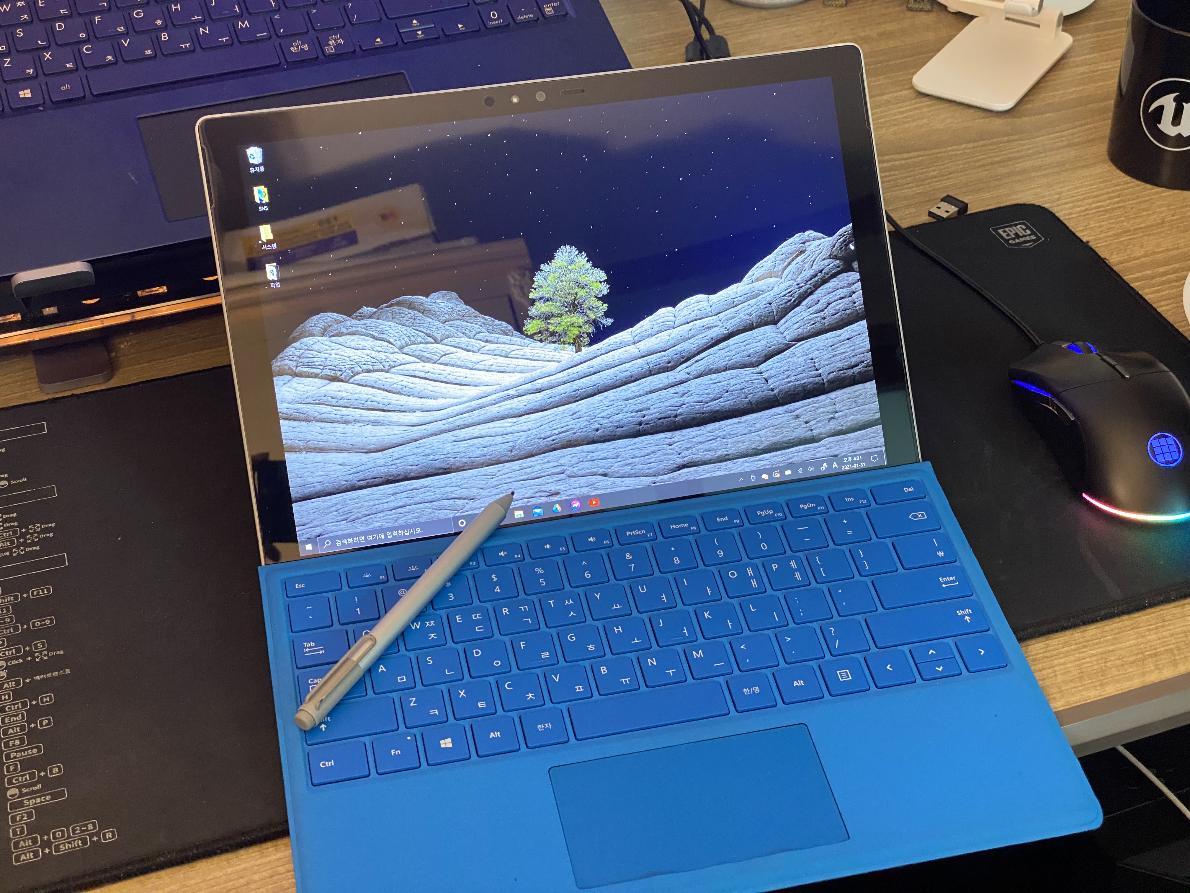 아래 타입커버 키보드와 펜슬까지 옆에 두고 사용하면