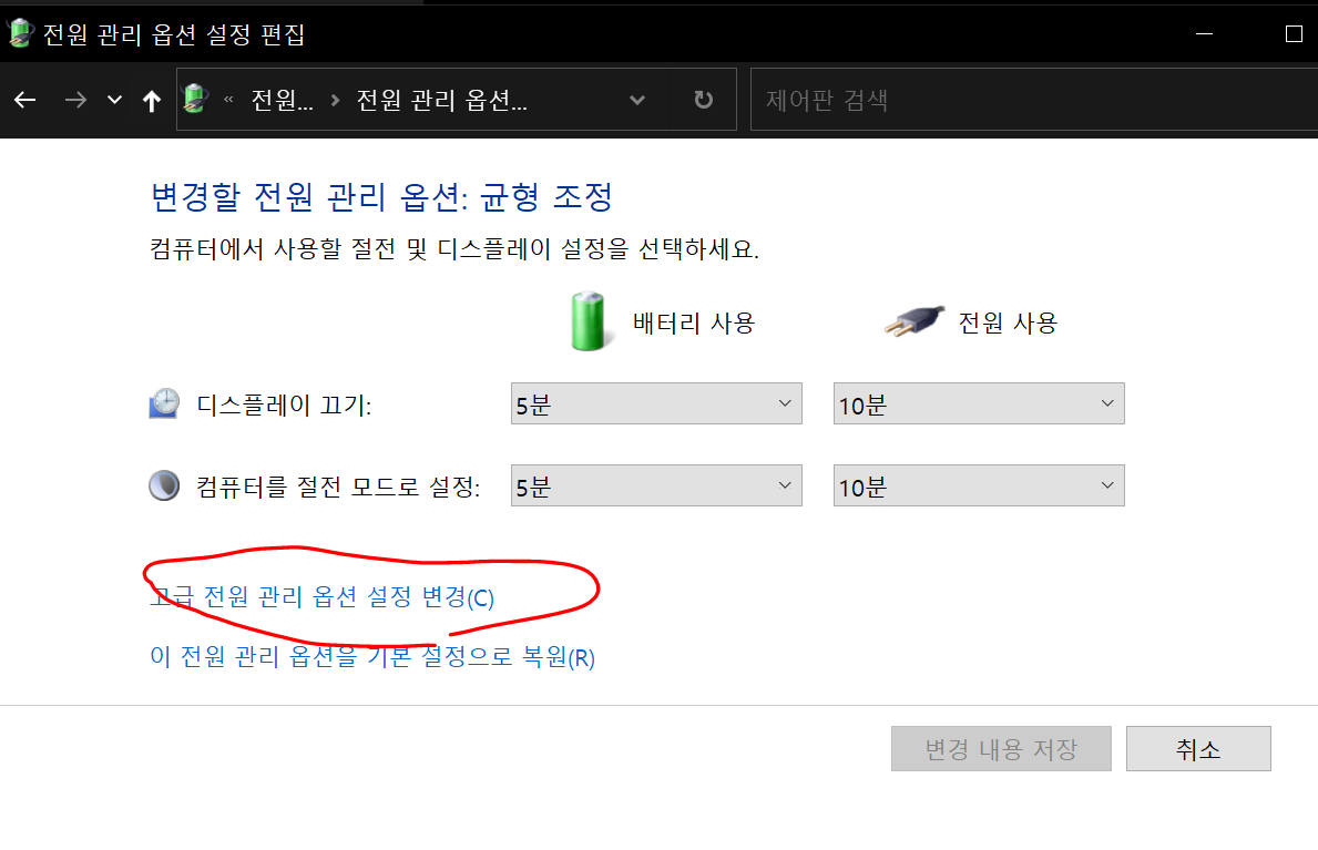4. '고급 전원 관리 옵션 설정 변경' 클릭.