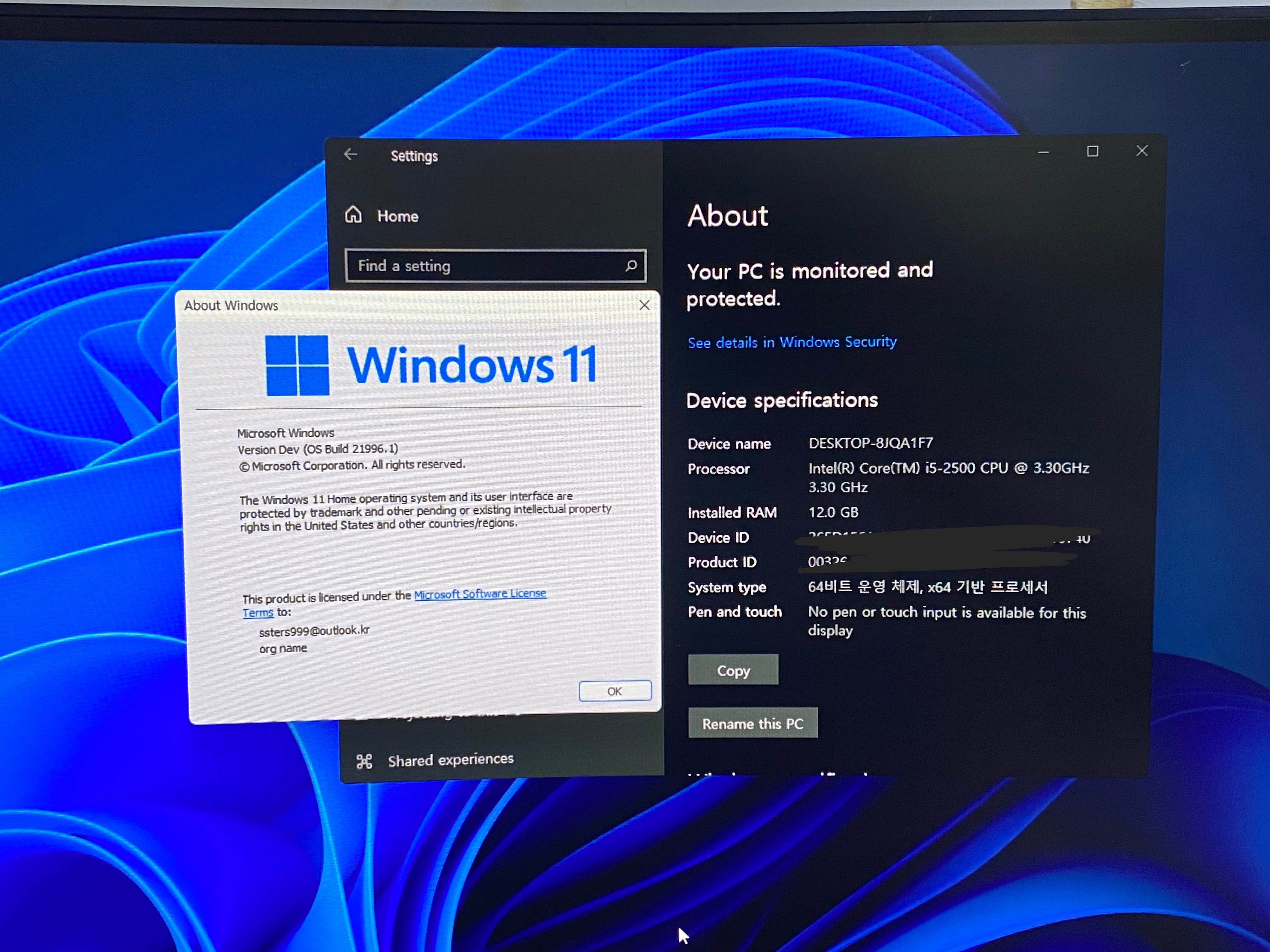 윈도우는 11버전 유출된 그 개발자 빌드 버전입니다.