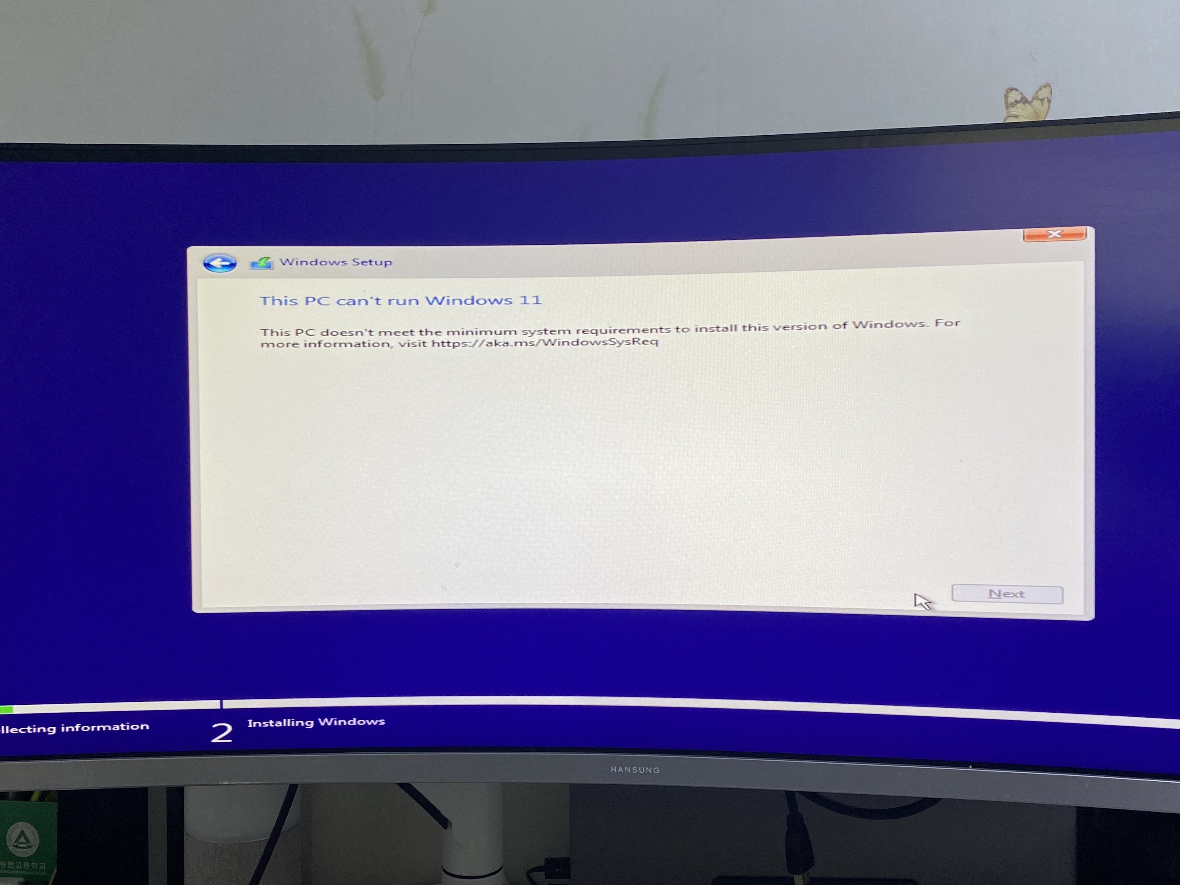 2. 설치 usb를 이용하여 구형기기에 설치를 하려고 할시 설치가 불가능하다는 메세지가 나온다.